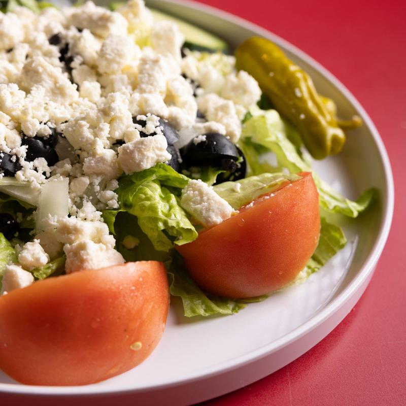 Lettuce, tomatoes, cucumbers, olives, pepperoncini, onions, and feta cheese & balsamic Italian dressing